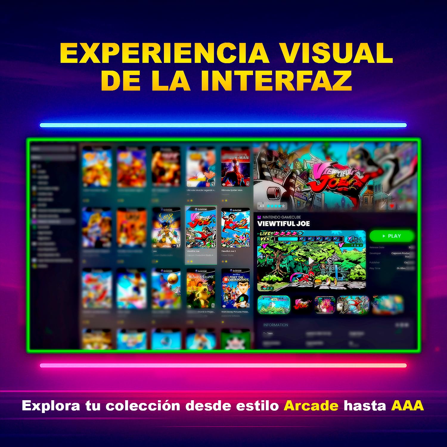 - Biblioteca y sistema: configuración pensada para retro gaming, arcade y diferentes generaciones clásicas.