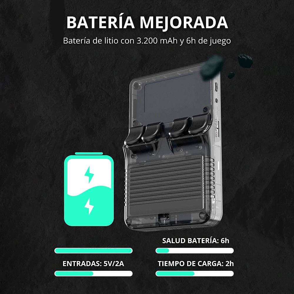 - 🟢【Batería】Esta consola portátil cuenta con una batería de polímero de litio de 3500mAh, proporcionando de 6 a 8 horas de juego continuo sin interrupciones. Ideal para sesiones largas de juego o viajes largos, podrás disfrutar de tus juegos retro favoritos durante horas sin preocuparte por recargar. Perfecta para disfrutar de jornadas intensas de juego sin interrupciones.