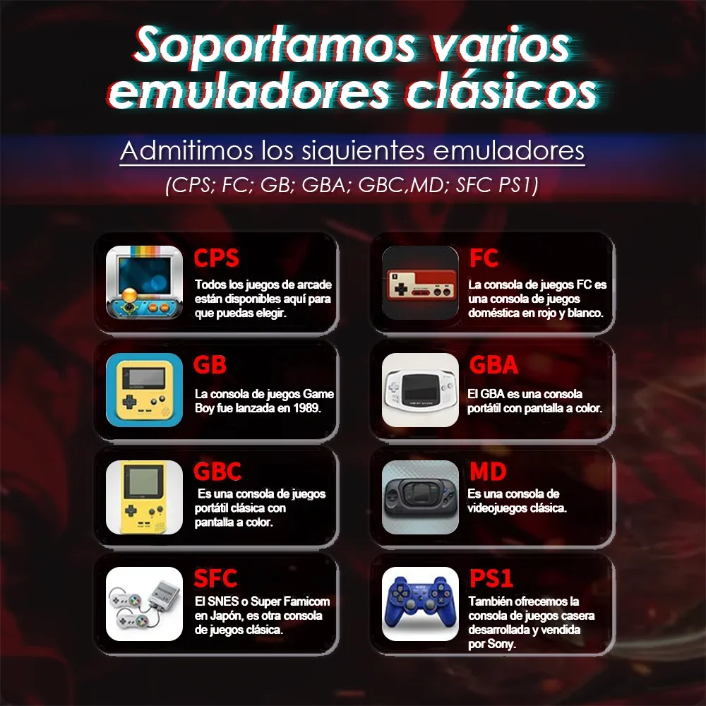 Juegos compatibles: MAME.MD, PSl, GBC, GB, ATARI, GBA, SFC, FC